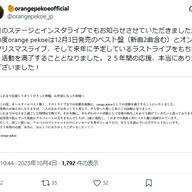 @orangepekoe_jp昨日のステージとインスタライブでもお知らせさせていただきましたが、この度orange pekoeは12月3日発売のベスト盤(新曲2曲含む)とオンラインクリスマスライブ、そして来年に予定しているラストライブをもちまして、活動を満了することとなりました。25年間の応援、本当にありがとうございました! pic.x.com/VwkXBkewWm