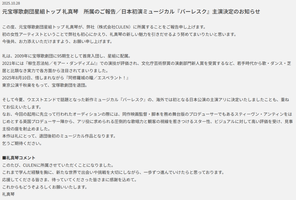 @takarazuka_infoさすが礼真琴!所属事務所決定&『バーレスク』主演発表! 礼さん自身がオーディションで勝ち取ったそうで、おめでとうございます。 #礼真琴 #バーレスク ▼宝塚観劇ブログ share.google/vyjwKX6gyMjvY4…